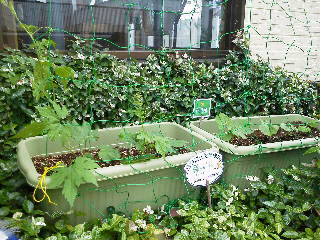 『緑のカーテンプロジェクト』 元気に成長しています バックも緑なので、ちょっと見にくいですが、葉の一枚が大きく成長し、ツルもしっかりネットに巻きついて います。 梅雨に入ってばかりで、晴れと雨が、成長には丁度いいのかな 少し遅れて移植した苗も、今の所元気に成長中
