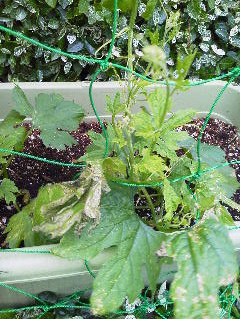 『緑のカーテンプロジェクト』 あ~ショック! ゴーヤが先日の台風でかなりのダメージ 強風と、雨で、茶色く変色してしまいました。 六月の台風なんて・・・・。 だんだん症状がひどくなってきました。真夏の日よけは難しいかな??