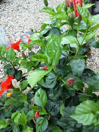 ハイビスカス・・・三年目 冬の間は室内で過ごしますが、暖房もない所なので、葉は黄色くなり全て落葉して、 枝だけになってしまいますが、春になるとちゃんと芽を出して、今年もいっぱい 花が咲きました この時期の花は一日しかもたないのが残念ですが、 真赤な大輪は存在感があります 順番待ちの蕾がまだまだ沢山なるので、毎日が楽しみです